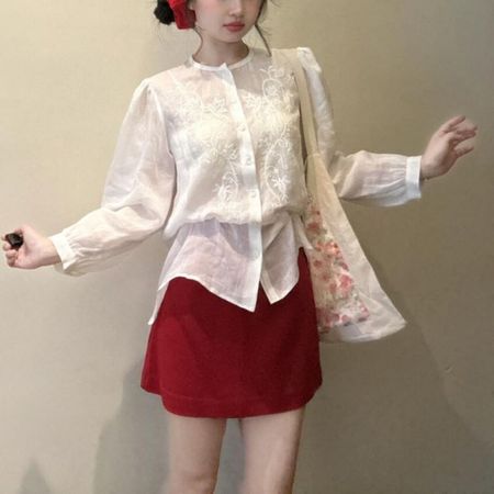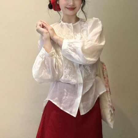 Women's Round Neck Embroidered Long Sleeve Shirt Slim Top